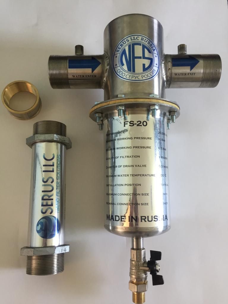 Nano Water Filter System's  main advantage over other filtration systems is the Self-Cleaning string-membrane filter element. It has the most efficient and reliable design for practical water purification: Our Brand  Serus Filters operate opposite of anything else. Water goes first into the filter around the stainless steel spiral microwire. Where only 0.8-1.0 micron or less can penetrate through the ultra-thin microwire.